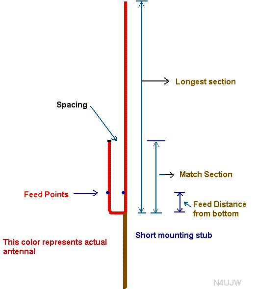 In the drawing above, you will see one long vertical element “spaced” a short distance from a shorter vertical element and connected at the bottom. This is called the “spacing” as you will see later in the lengths section of this article below. The feed points, noted by the dots in the drawing near the bottom, are actually connected to a part of the lower matching section that consists of a 1/4 wave section. These feed points are the connection points for the coax feed line. The shield of the coax connects to the SHORTEST ELEMENT. The center conductor connects to the longest element. You will want to make these connections temporary at first for swr tuning.
