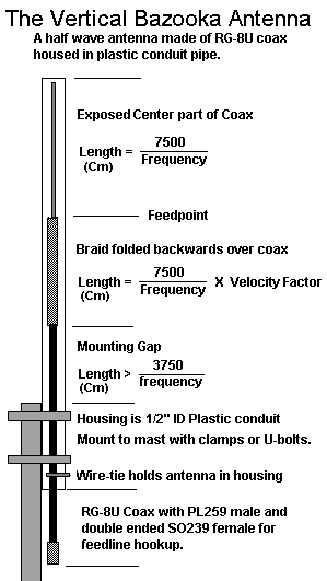 You can use the formulae in the diagram above to create Vertical Bazooka dipoles for any frequency. However; practical considerations of mounting and support tend to limit it to the span from 10meters (28mhz) to 70cm (440mhz). Below about 25mhz the housing tube becomes very long and can be difficult to support. Above about 450mhz you are pushing the frequency limits of the coax which are affected by the lower braid section of the dipole.