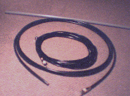 To the left is a shot of the antenna all ready to be assembled and put to work. Note that I have put heat shrinkable tubing over the braid part of the antenna. This is to prevent it from moving after assembly, vinyl tape should work as well. If the braid moves inside the housing, the SWR will be affected.