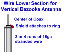 In this modification you replace the shield section with 3 or 4 runs of insulated 16ga lamp wire. To do this cut the braid and twist it to form a short stub for soldering. Make a ring of wire to fit around the coax, attach the wires to the ring and solder to the shield braid. The wires are then secured to the sides of the coax with heat shrink tubing. To adjust this new bottom section, clip bits off the ends of the wires. This modification has the advantage that you can still roll the antenna up, if used for an emergency antenna.